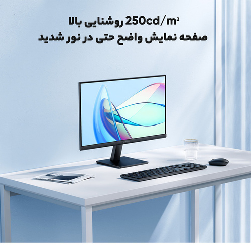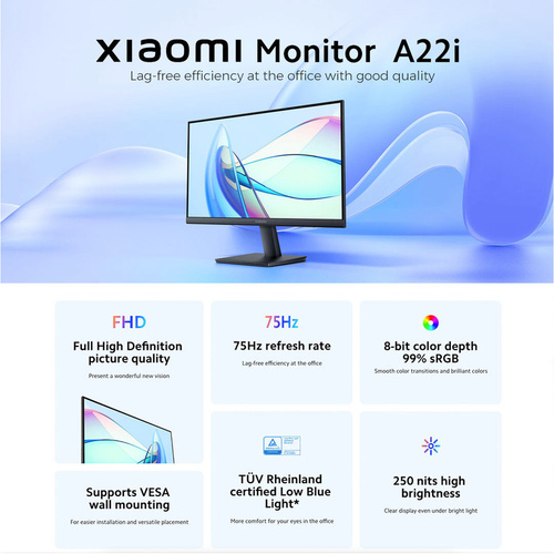 مانیتور شیائومی مدل A22i نسخه ارتقاءیافتهای از مدل A22 است که در تاریخ 4 دسامبر 2023 معرفی شد. این نمایشگر 22 اینچی از نوع LCD با وضوح Full HD معادل 1080 × 1920 پیکسل طراحی شده و نرخ نوسازی 75 هرتز بههمراه زمان پاسخگویی 6 میلیثانیه را ارائه میدهد. پنل این دستگاه از نوع VA بوده و با پوشش 99 درصدی فضای رنگ sRGB و کالیبراسیون حرفهای با اختلاف رنگ کمتر از ΔE 2، دقت رنگ بالایی را در اختیار کاربران قرار میدهد. نمایشگر A22i از نسبت کنتراست 3000:1، روشنایی 250 نیت و توانایی نمایش 16.7 میلیون رنگ برخوردار است. زاویه دید گسترده 178 درجهای نیز تجربه بصری مطلوبی را در موقعیتهای مختلف فراهم میکند. از لحاظ درگاههای ارتباطی، این محصول به یک پورت VGA و یک درگاه HDMI 1.4 مجهز شده است. پایه مانیتور امکان تنظیم شیب در بازه 15+ تا 5- درجه را دارد و طراحی باریک با ضخامت 7.5 میلیمتر، جلوهای مدرن به آن بخشیده است. همچنین وجود سیستم دفع حرارتی مخفی و فناوری کاهش نور آبی، تجربهای ایمنتر و کاربرپسندتر برای استفادههای طولانیمدت فراهم میسازد.